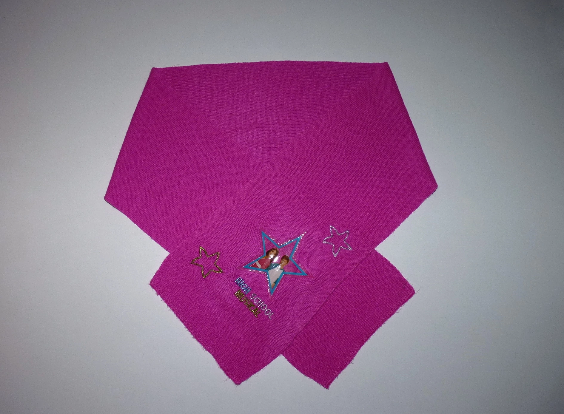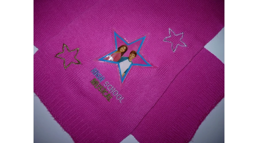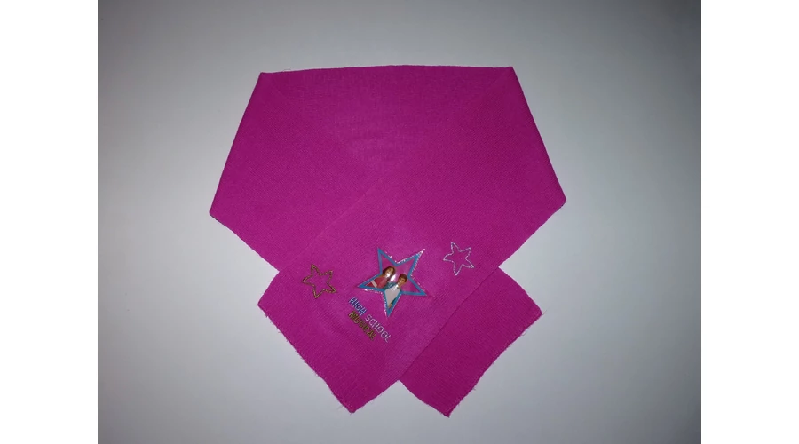 Vékony kötött sál bordázott véggel, színes, csillogó hímzéssel, High School Musical csillaggal. |