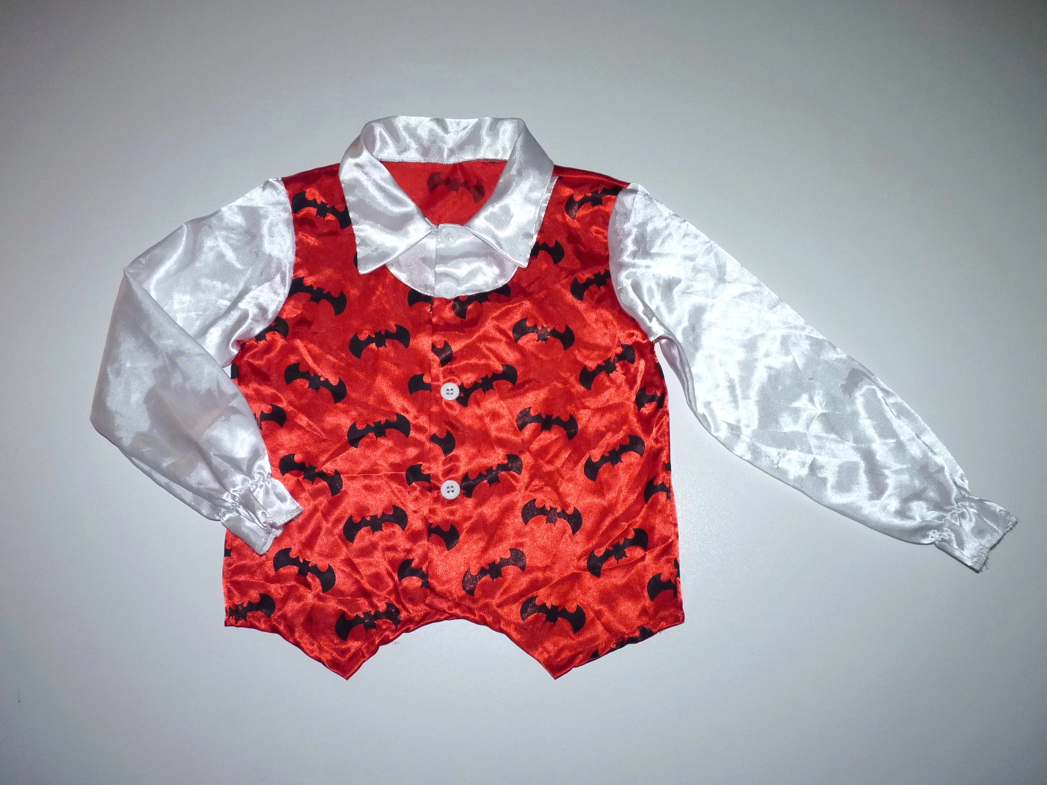 Vagány vámpír ing hosszú ujjal, gumírozott kézelővel, kihajtott gallérral, denevéres mintával. Jó állapotú, apró szálhúzódások. Beleírt méret 4-6 év. |