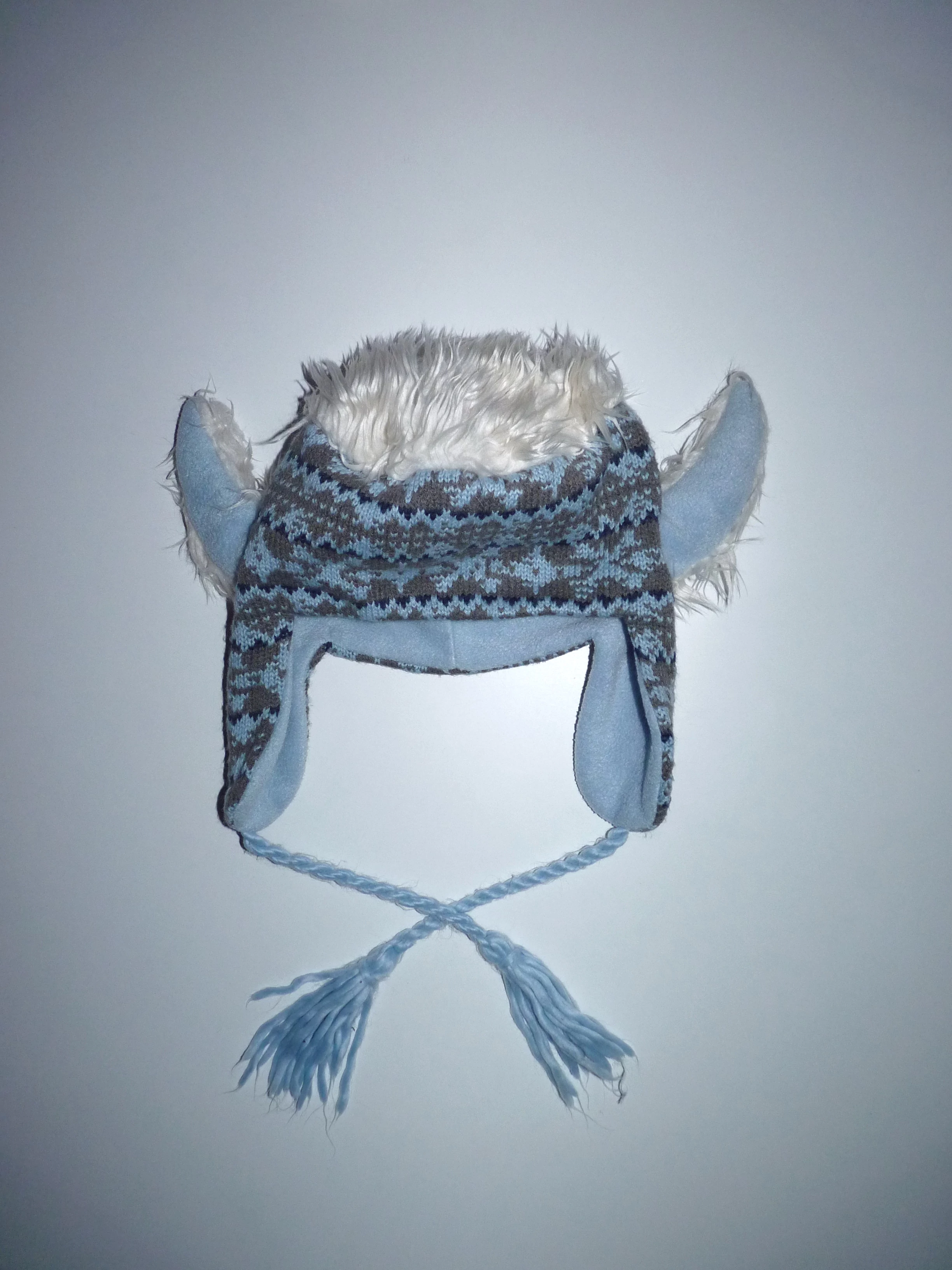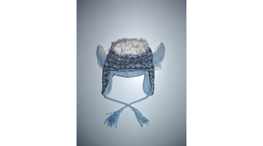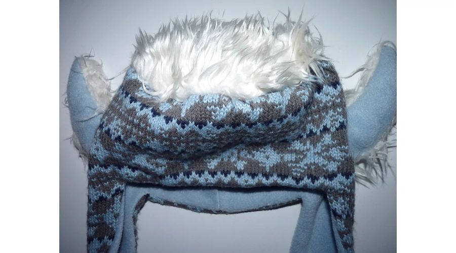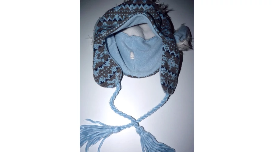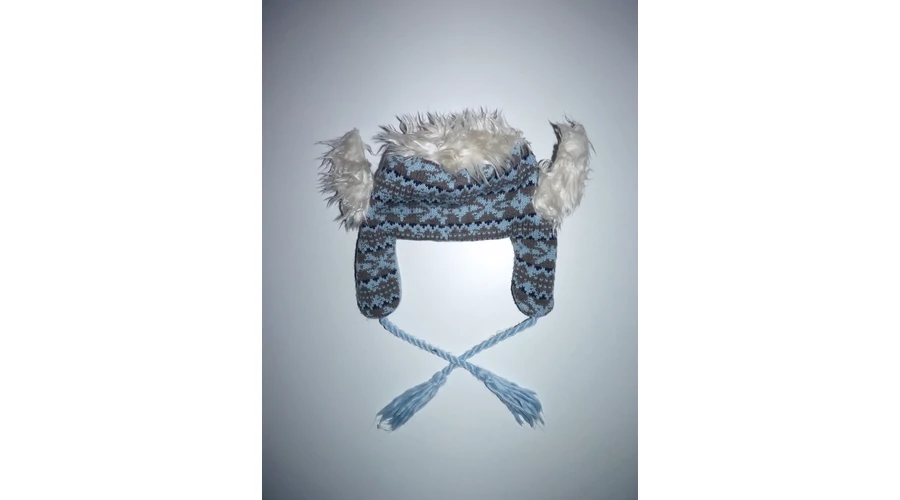 Kötött füles sapka polár béléssel, vagány rátétekkel, fejtetőn különleges fehér műszőrmével. Jó állapotú. Beleírt méret nincs.