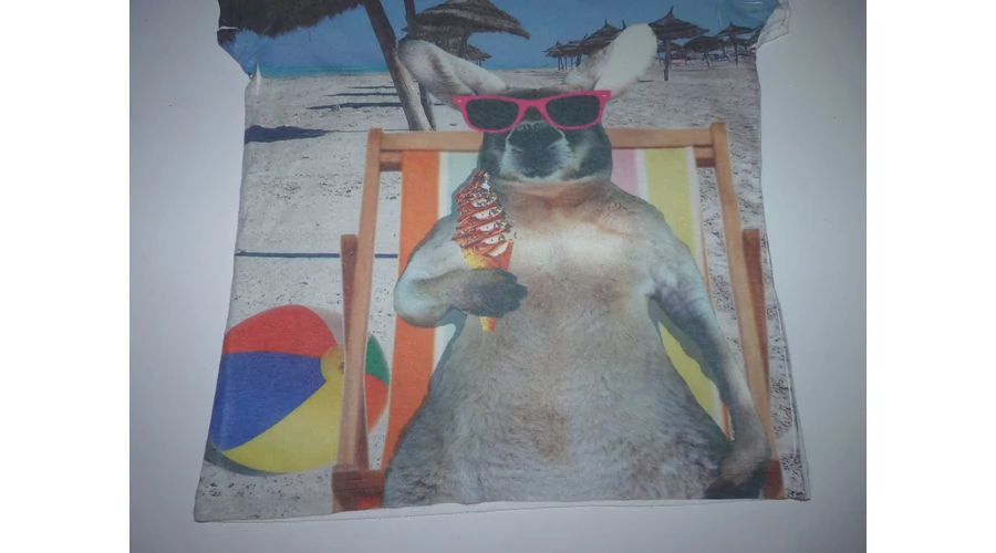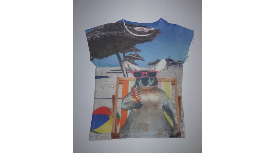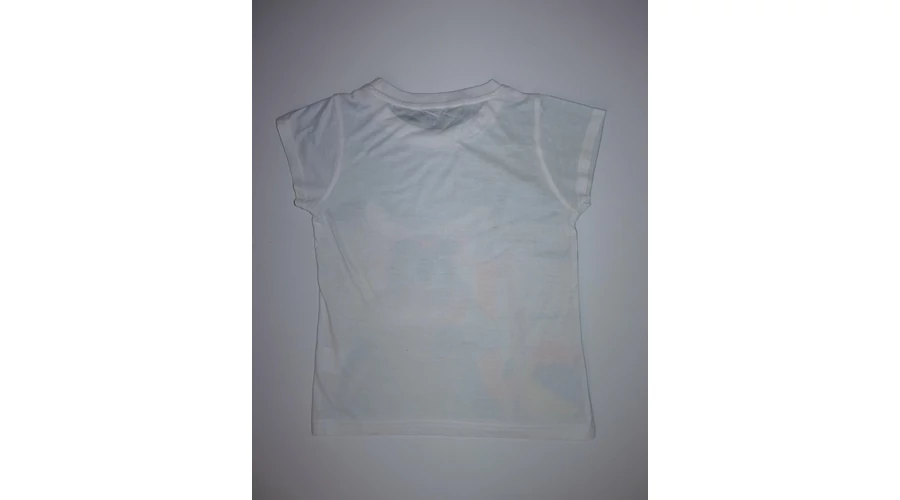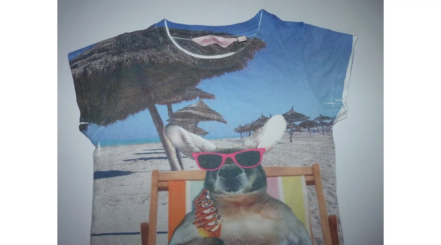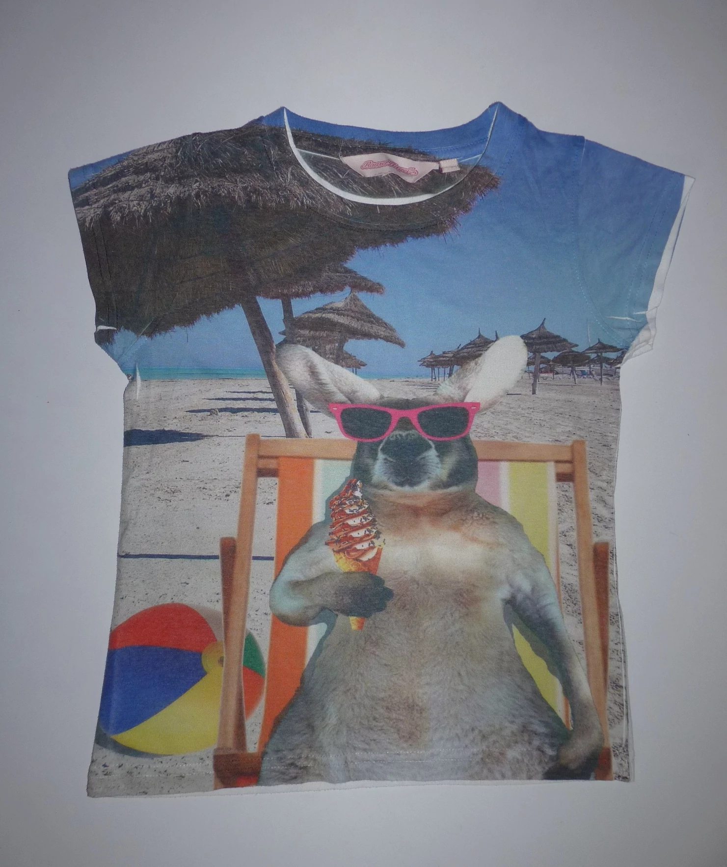 Laza fazonú, nyomott mintás póló rövid ujjal, bordás passzés nyakkivágással, elején vidám tengerpari motívummal. Jó állapotú, minimális bolyhosodás. A minta halványan a hátsó fehér részén is látszik. Beleírt méret 9-10 év. |
