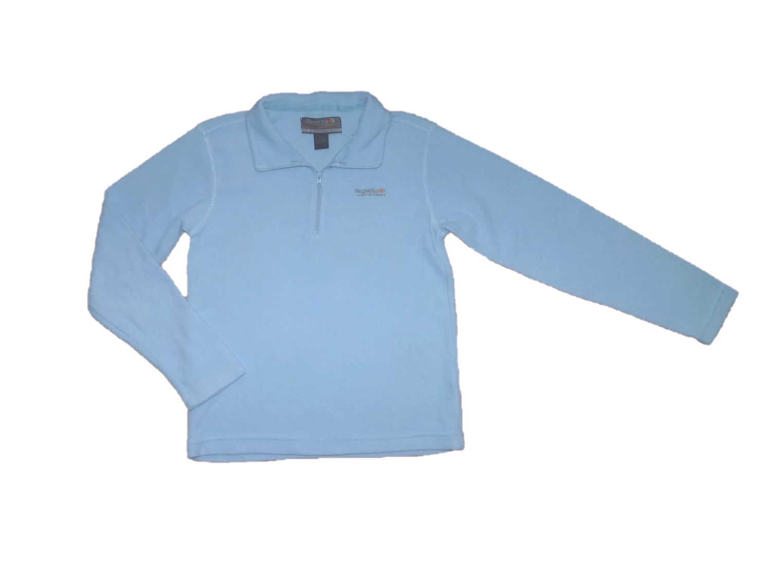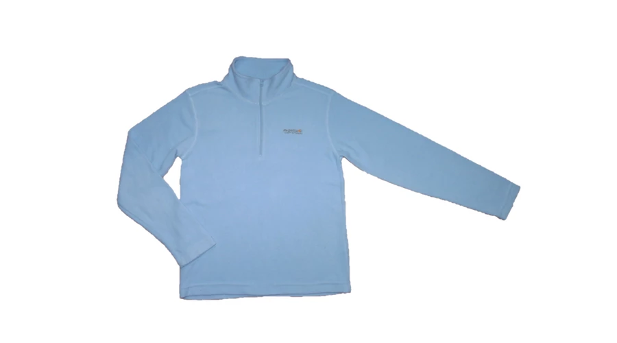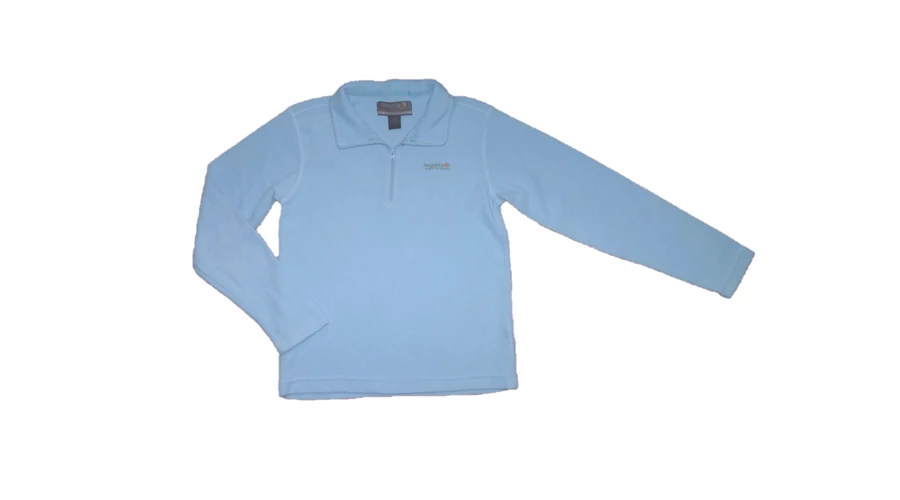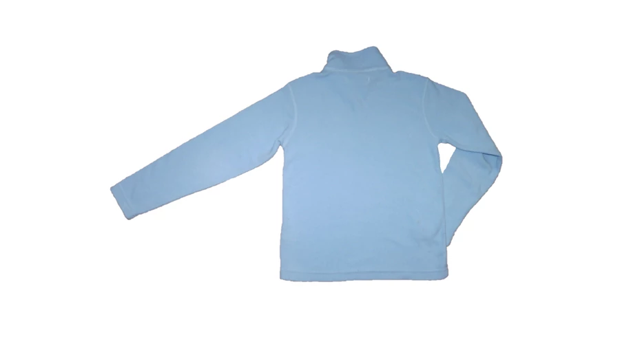 Puha világoskék polár pulóver hosszú ujjal, magasított nyakán cipzárral, mellrészén márkafelirattal. Jó állapotú, hátul két kicsi nagyon halvány folt. Beleírt méret 11/12 (152) |