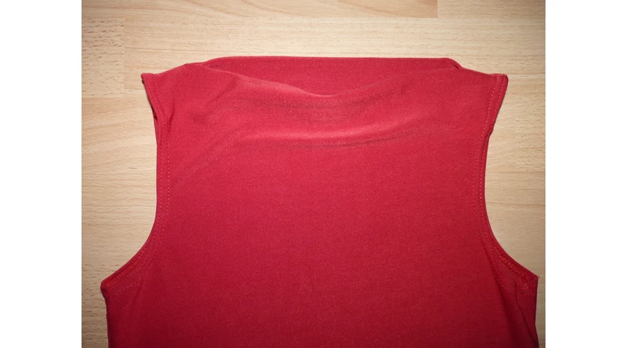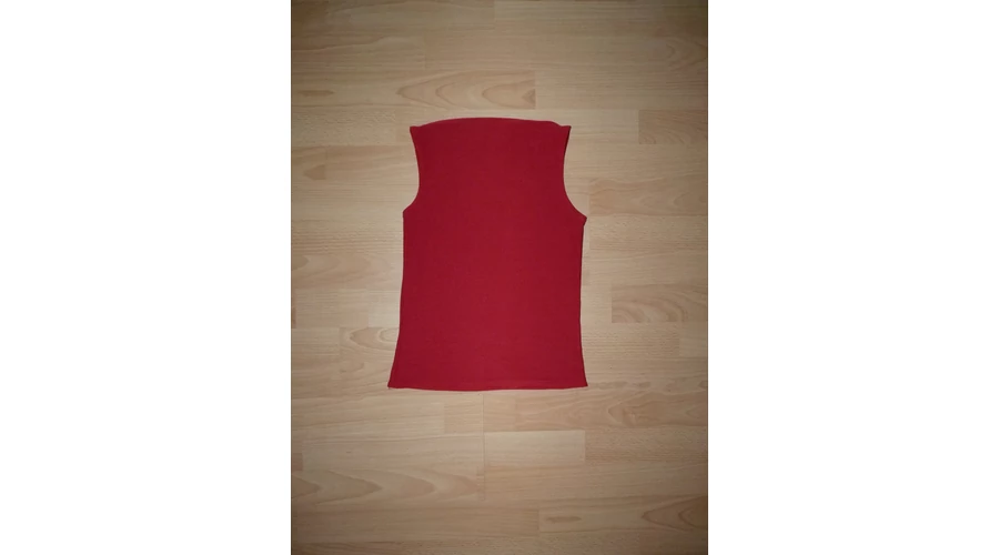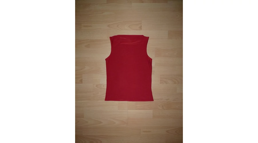 Csinos piros felső lágy esésű nyakkivágással, rövid, ujjatlan fazonban. Beleírt méret nincs. |