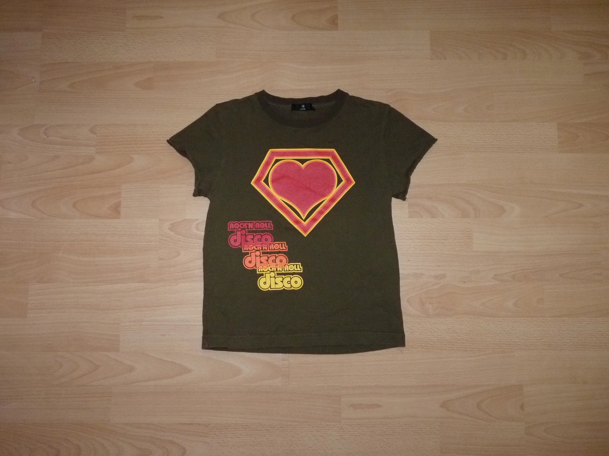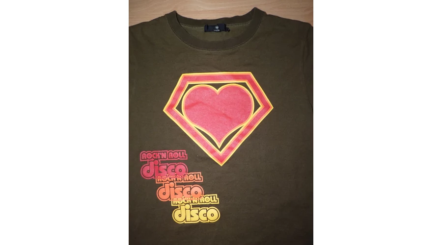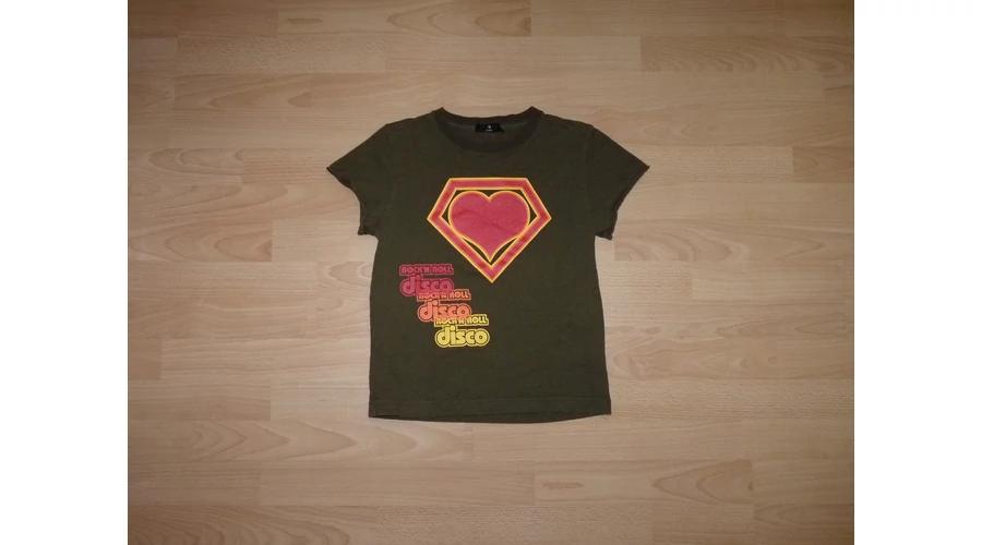 Kellemes viseletű, sötét kekizöld színű, szív és disco mintával díszített póló, melyet még vagányabbá tesz sodort ujja. Tökéletes rövid és hosszú farmerrel, de akár szoknyával is. Nagyon jó állapotú, hibátlan mintával. |