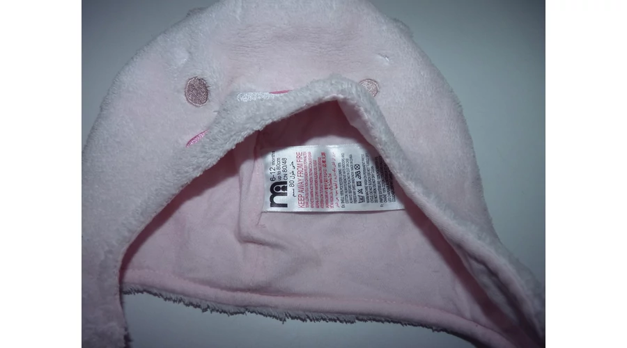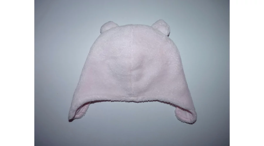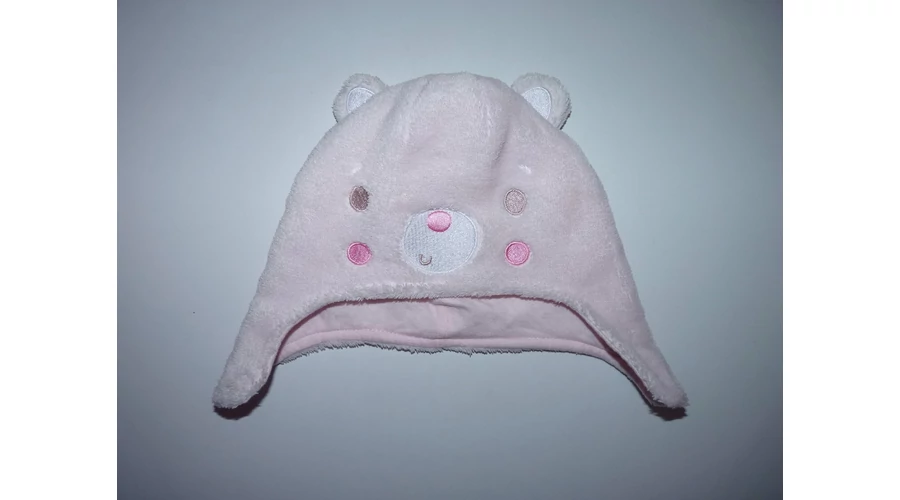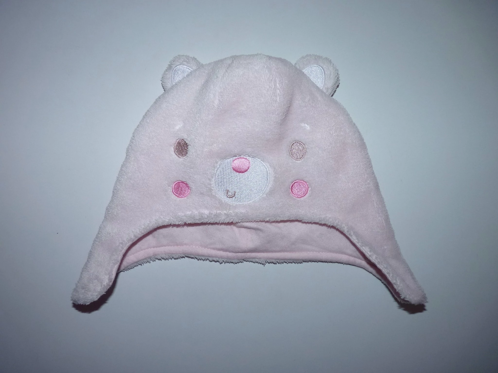 Kellemes viseletű, pihe-puha plüss sapka. Halványrózsaszín színű, pamut béléssel, hímzett maci arccal, tetején fülekkel. Nagyon jó állapotú. Beleírt méret 6-12 hó (up to 80)
