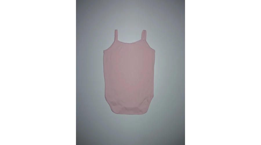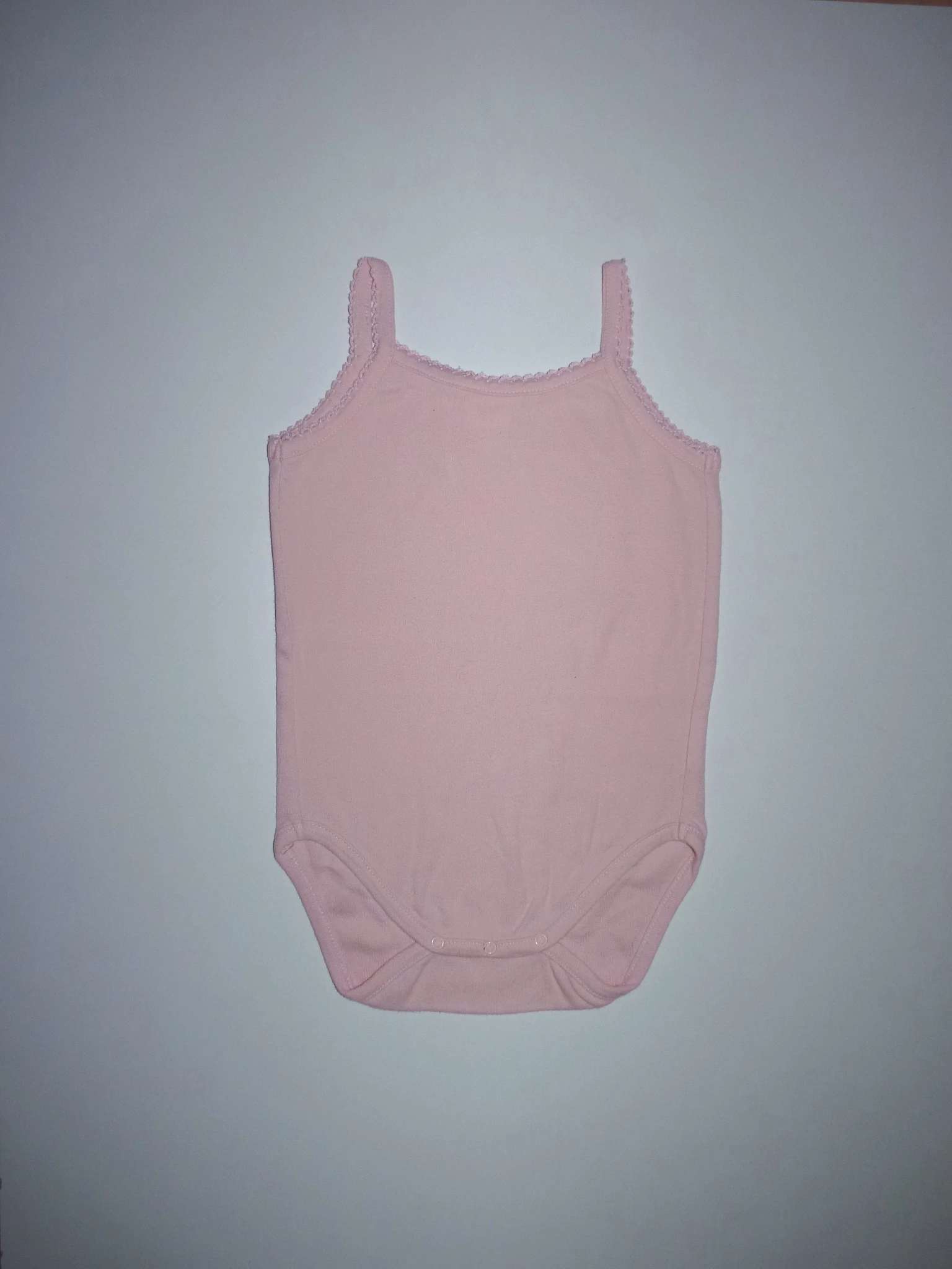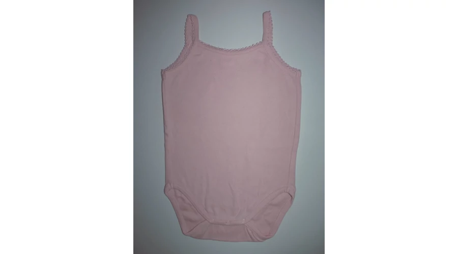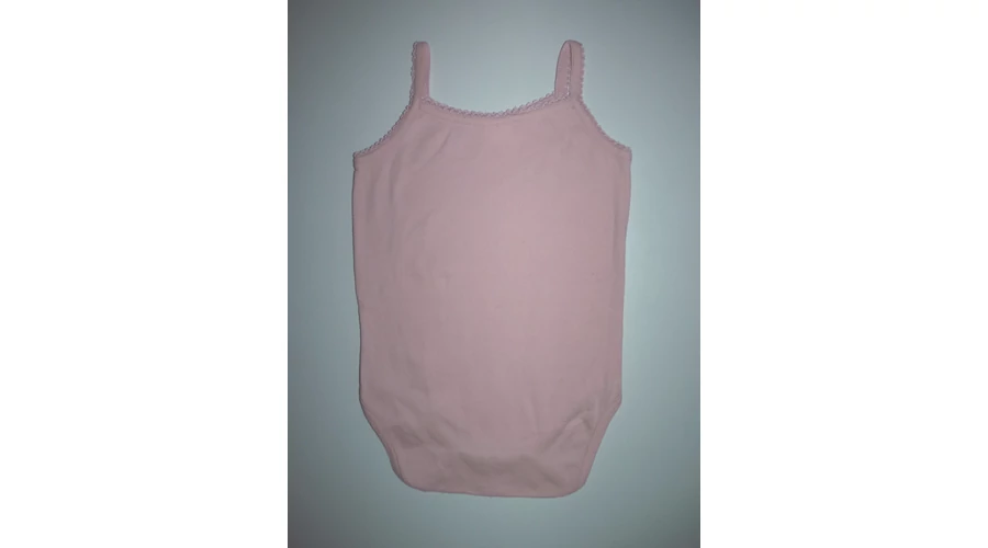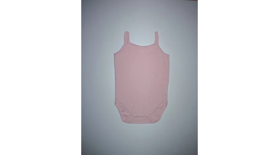 Puha, rózsaszín pamut body, patentos üleppel, dekoratív nyak- és karkivágással, keskeny vállpánttal. Beleírt méret 23 hó. |