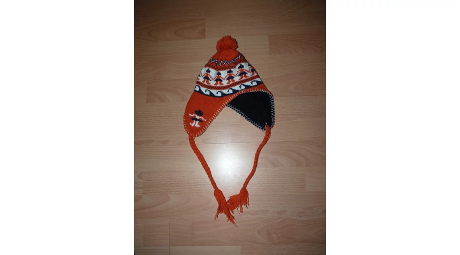 Narancssárga-fehér-fekete-sötétlila színű, füles kötött sapka kötővel, belül polár béléssel. Jó állapotú, némi bolyhosodás felfedezhető. Alsó átmérője (az alsó hosszú mintánál mérve): 20-24 cmx2 Tetejétől a füles aljáig a hossza: 27 cm |