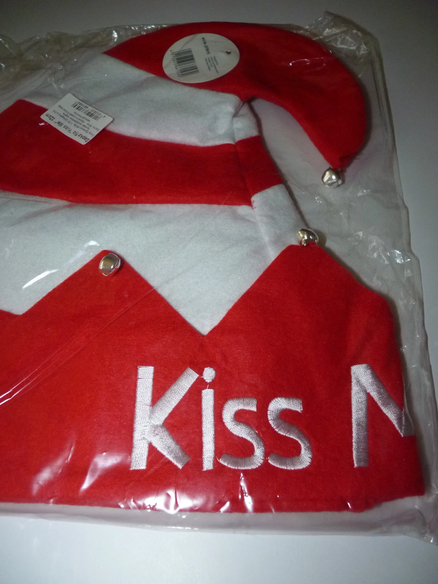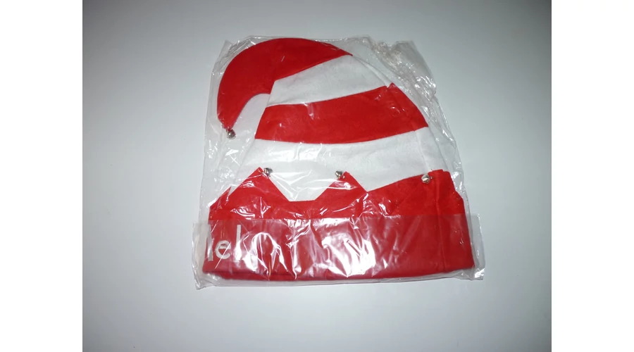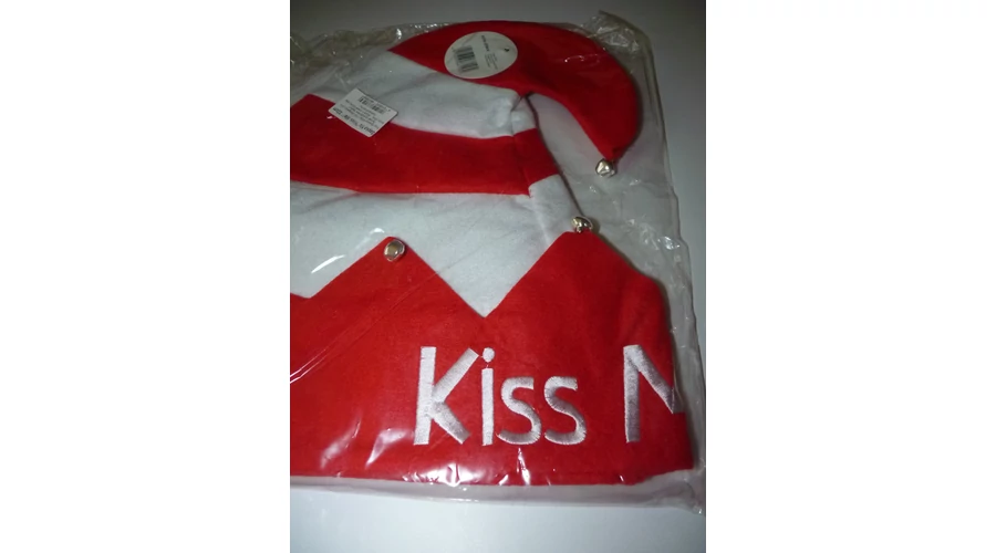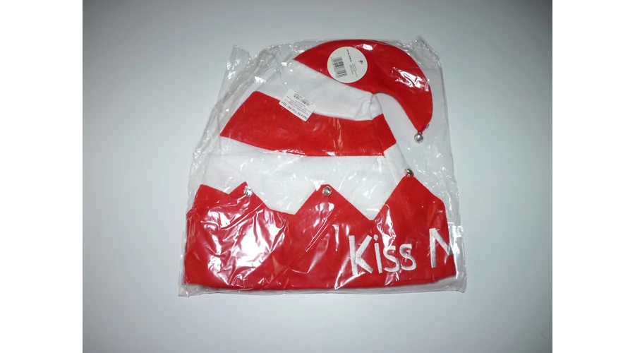 Szuper Mikulás sapka különleges fazonnal, apró csörgőkkel. Piros-fehér csíkos, elején hímzett "Kiss Me" felirat. Filc anyagból készült, új bontatlan csomagolás.