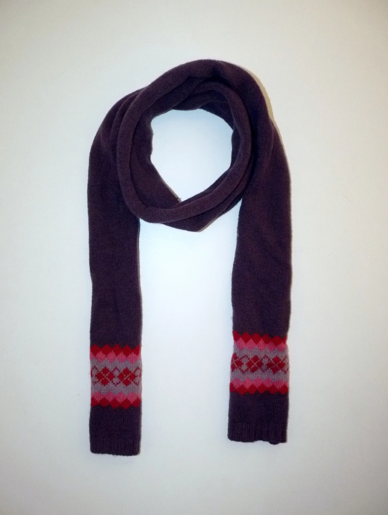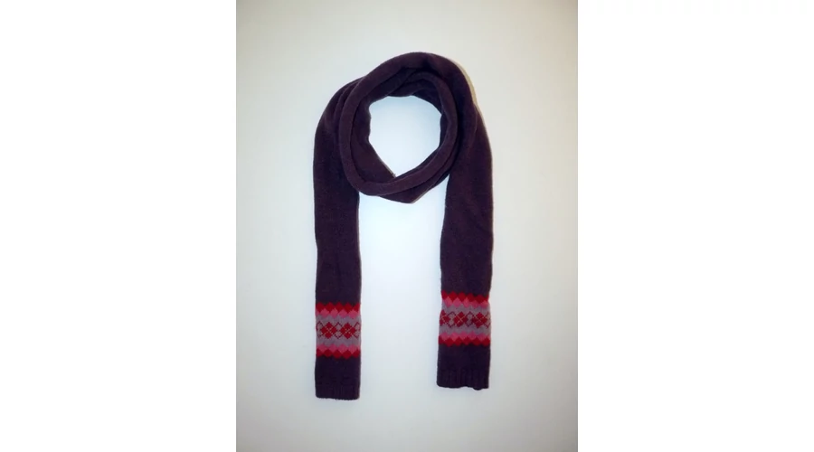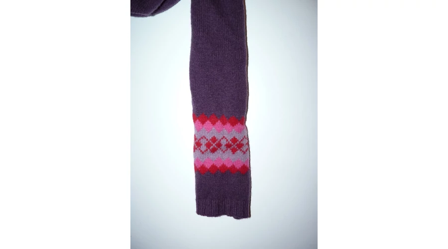 Lila, gépi kötött sál, két végén mintával. Könnyű, két oldalról lazán befelé pöndörő, jó állapotú.