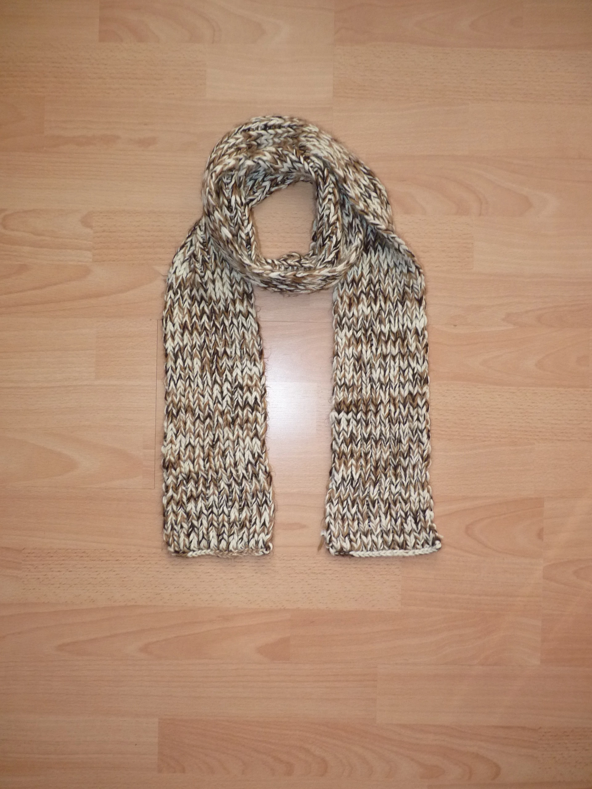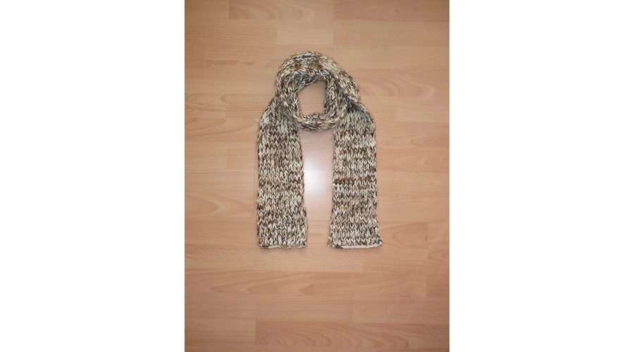 Vajszínű-világosbarna-sötétbarna színű, lazán kötött puha sál