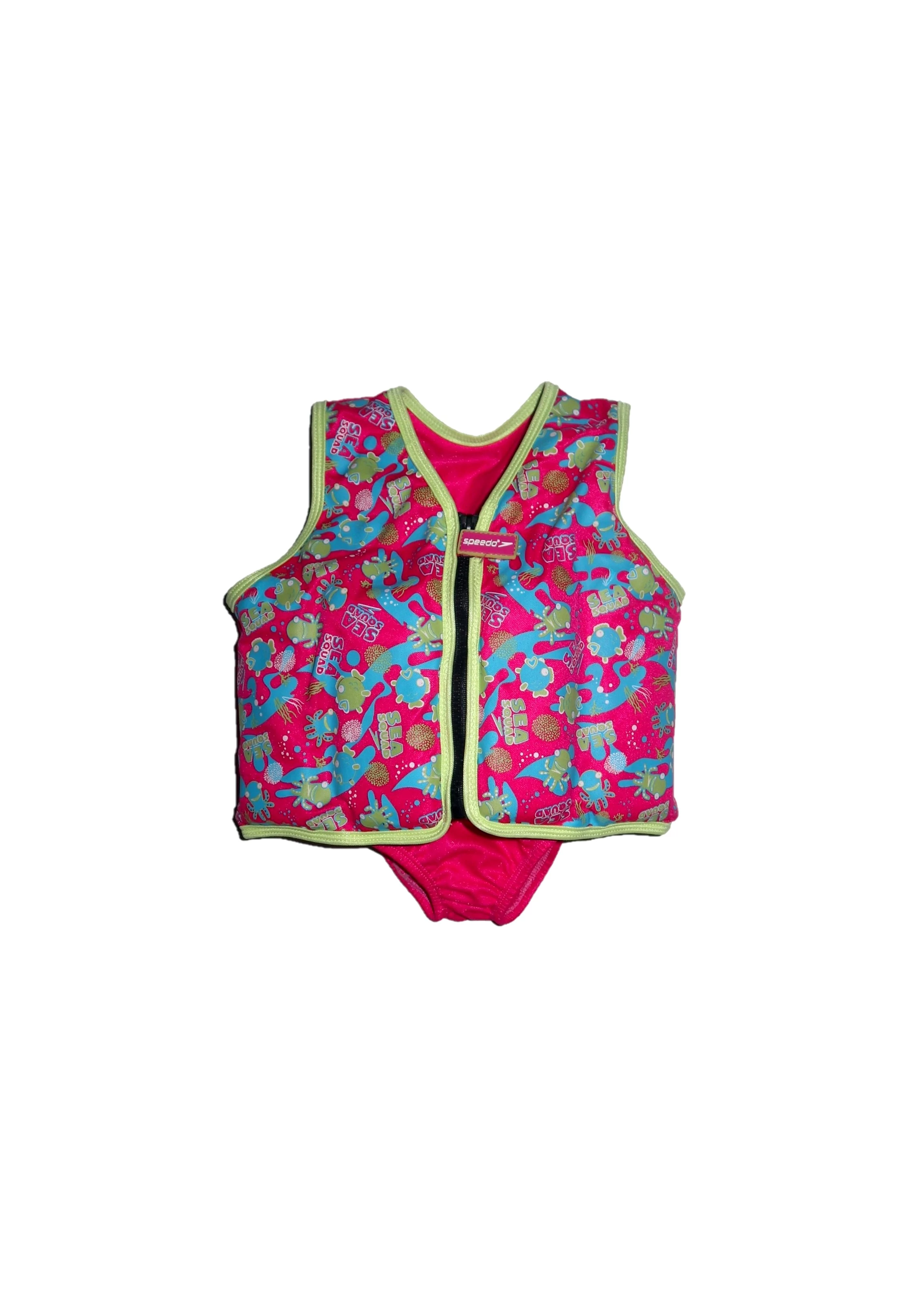 | A Speedo gyerek mellény nagyszerű segédeszköz úszásoktatáshoz, strandoláshoz, mert körülöleli a gyerek testét, fent tart és nem akadályoz, maximális mozgásszabadságot biztosít. A mellényben 8 db kivehető speciális úszószivacs gondoskodik arról, hogy a gyerek biztonságosan érezze magát, ezáltal a vízben töltött minden percét kiélvezheti. A mellény élénk ciklámen színű neonszín szegéllyel, vidám tengeri állatokkal (polip, halacskák) díszítve, elől vastag cipzár tépőzáras cipzár védővel. A hozzá tartozó fürdőnadrág a mellényhez patentolható.Európai és Ausztrál előírások által gyártva. Nagyon jó állapotú. A mért adatok a kihúzás nélkül mért adatok! Beleírt méret 2-3 év (15-18kg)Figyelmeztetés: A mellény segédeszközként szolgál, nem pedig mentő kellékként, ezért fontos, hogy a gyerek egész idő alatt szem előtt legyen használatakor a vízben! | |