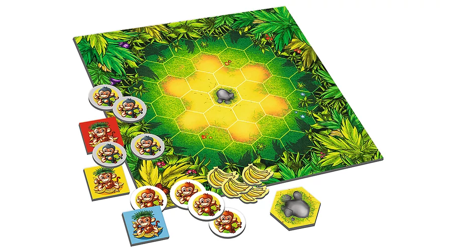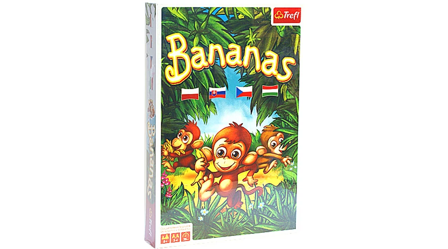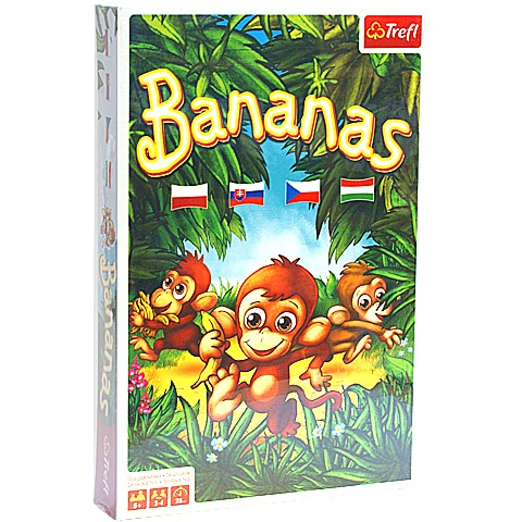 Trefl Banános társasjáték. Vidáman telt az este a majmok számára, hiszen rengeteg banánt szereztek, majd a tisztáson mulatoztak. Reggelre azonban forró napsütésre keltek, így a tisztást szerették volna gyorsan elhagyni.Vajon kinek sikerült társait előbb kivezetni a hűs árnyékba?!A Bananas egy nagyon könnyen tanulható társasjáték, mely 2 - 6 játékos részére készült, az átlagos játékidő rövid, 20 perc. A játék elsősorban gyerekeknek készült, akár már 5 éves kortól is játszható, erősen épít a hatszög-rács és a memória mechanizmusokra, így fejlesztő hatású is.Tartalma: