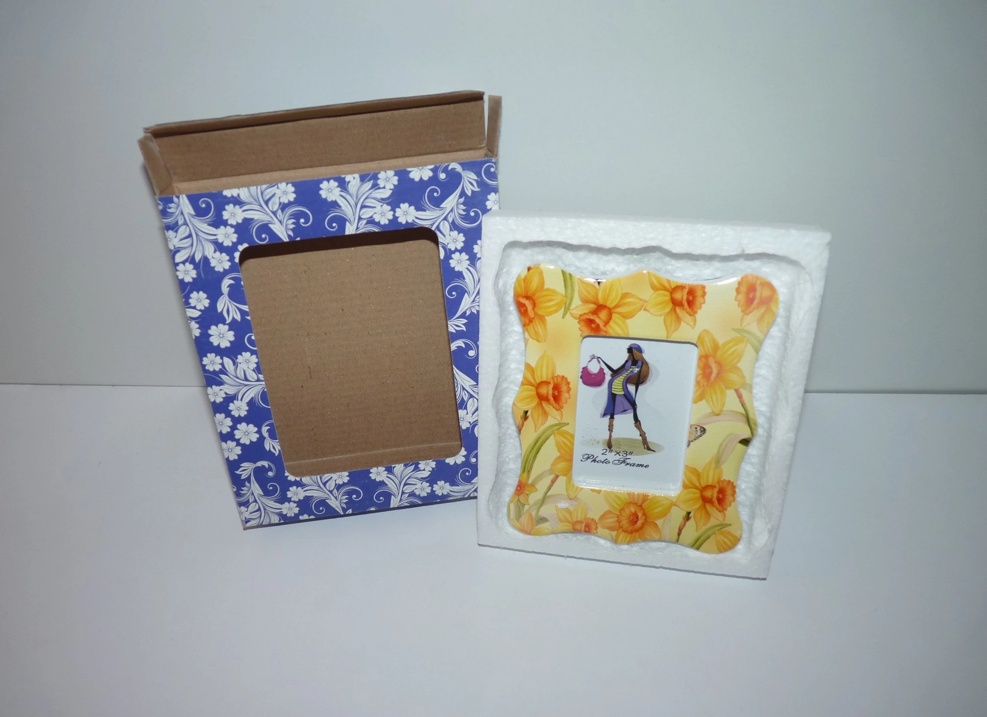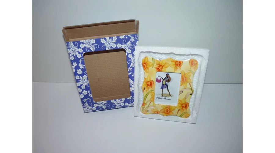 Sárga színű, virágokkal díszített kerámia képkeret. Tökéletes ajándék, benne a gyermek családja/barátnője/barátja/házi kedvence... képével.Mérete: 2"x3" (~7x9cm) |