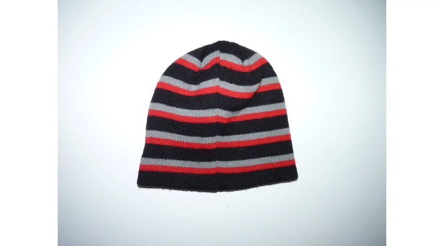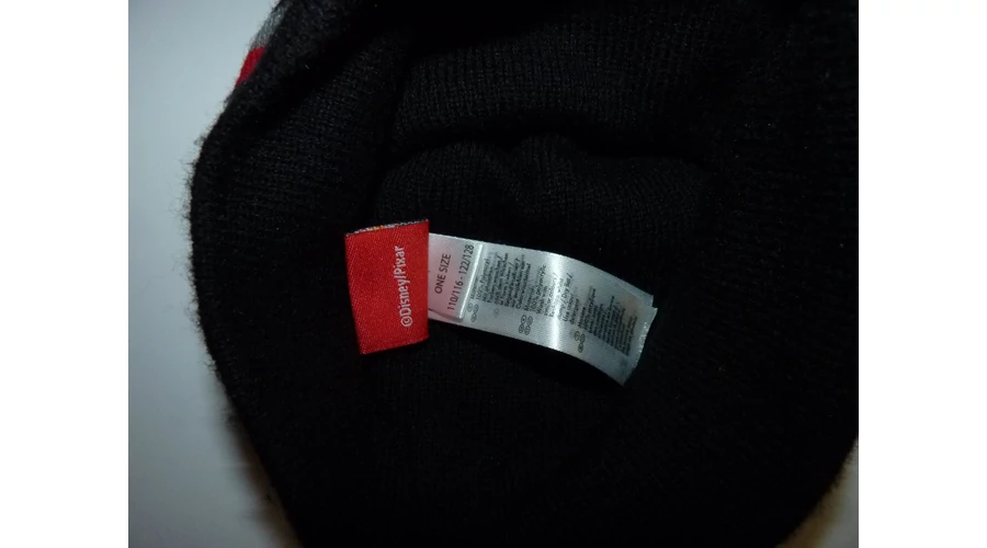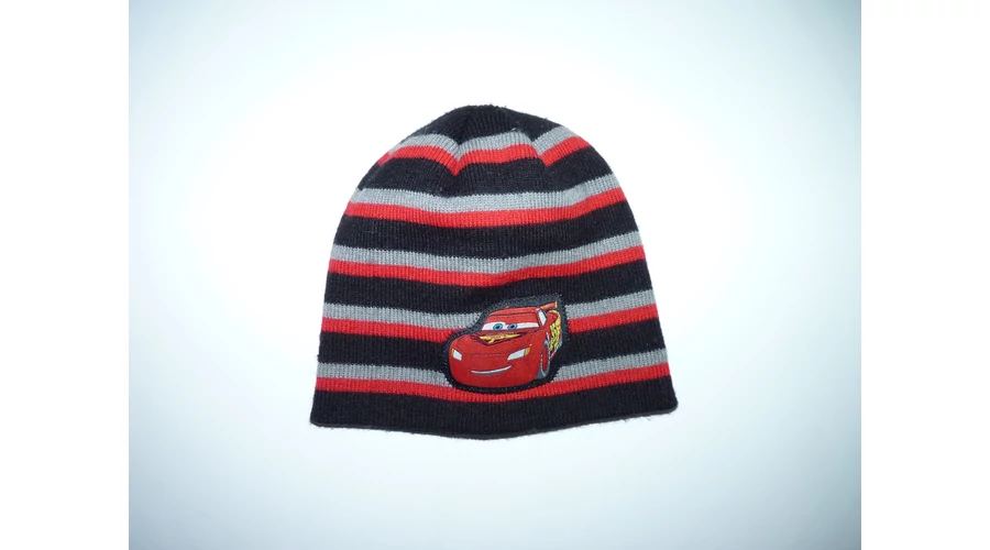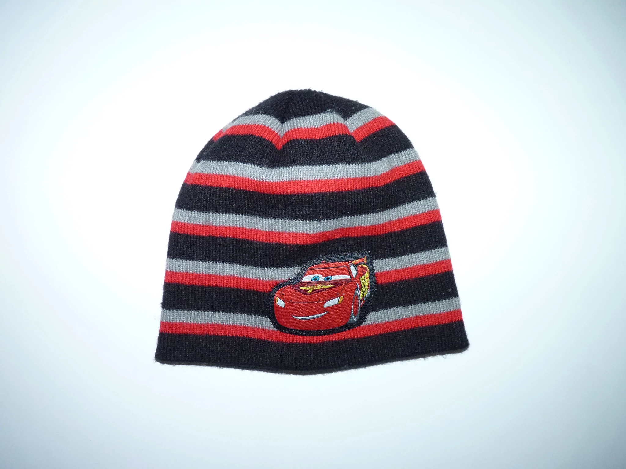 Kellemes viseletű,fekete-szürke-piros csíkos kötött sapka, elején Villám McQueen mintával. Jó állapotú. Beleírt méret nincs.